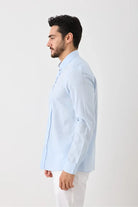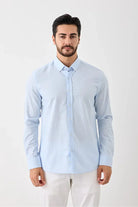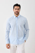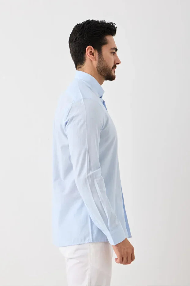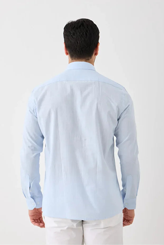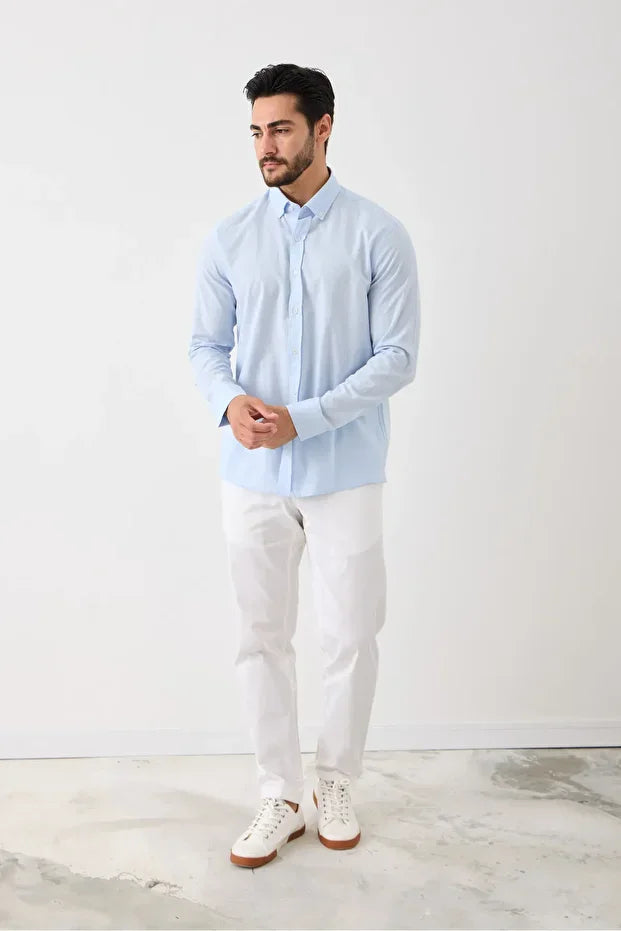 Uzun Kol %100 Pamuk Slim Fit Erkek Gömlek - Düğmeli, Keten Görünümlü, Serin Tutan Kumaş Açık Mavi