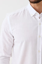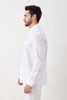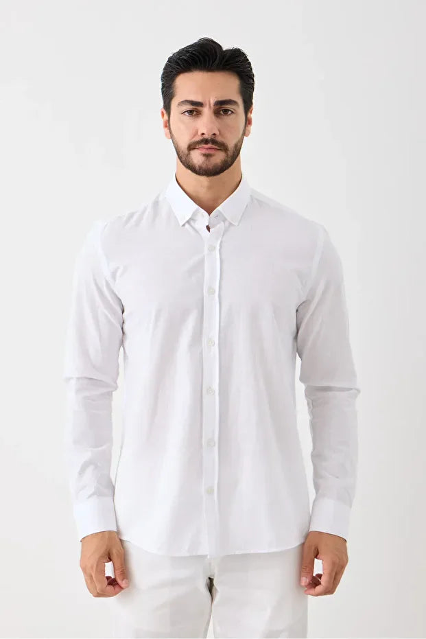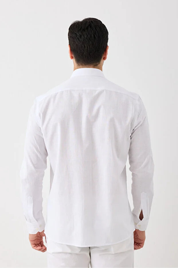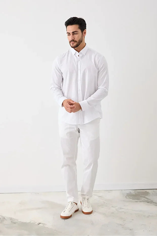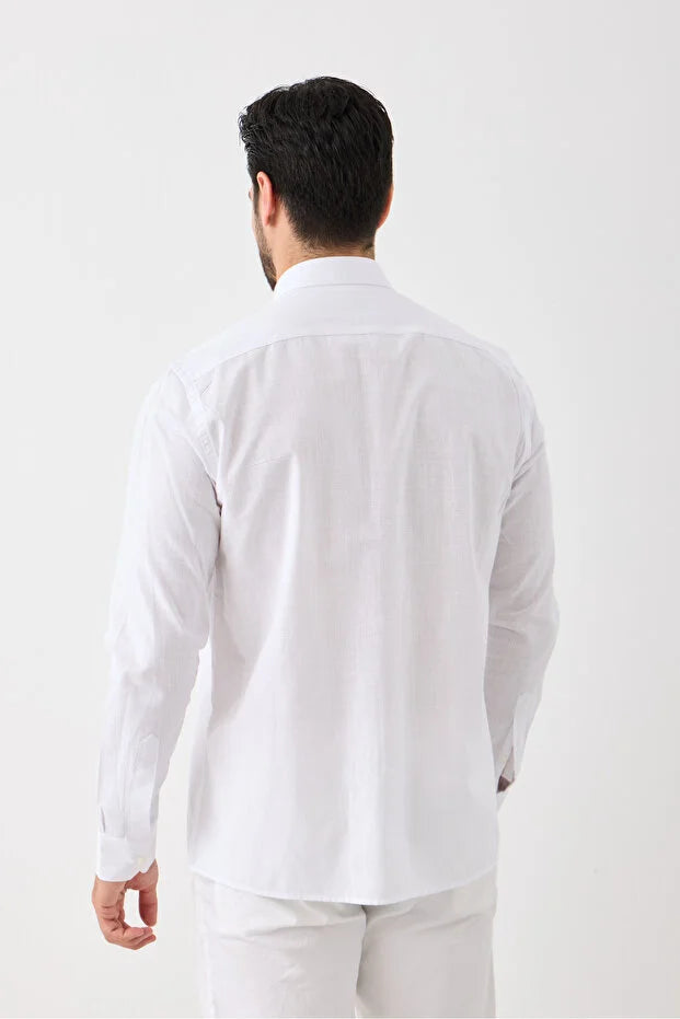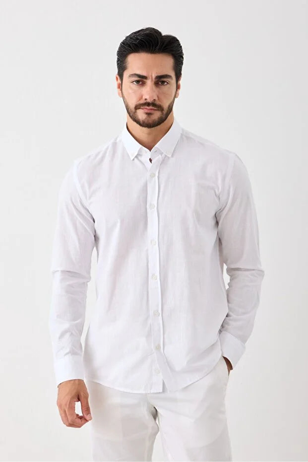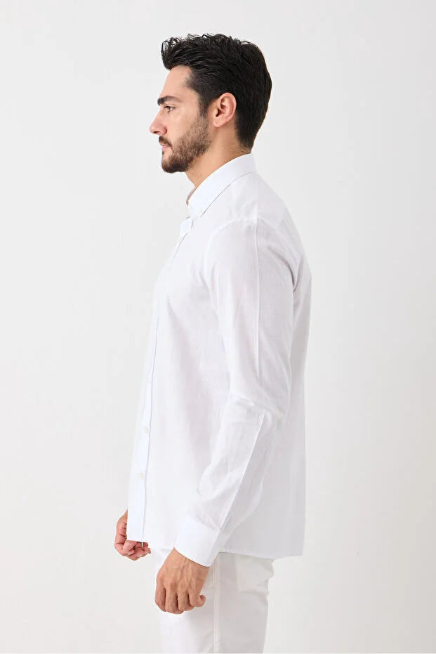 Uzun Kol %100 Pamuk Slim Fit Erkek Gömlek - Düğmeli, Keten Görünümlü, Serin Tutan Kumaş Beyaz