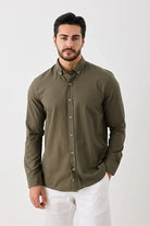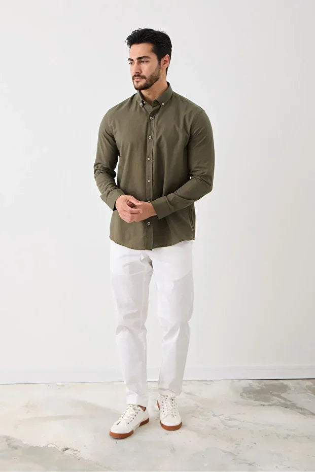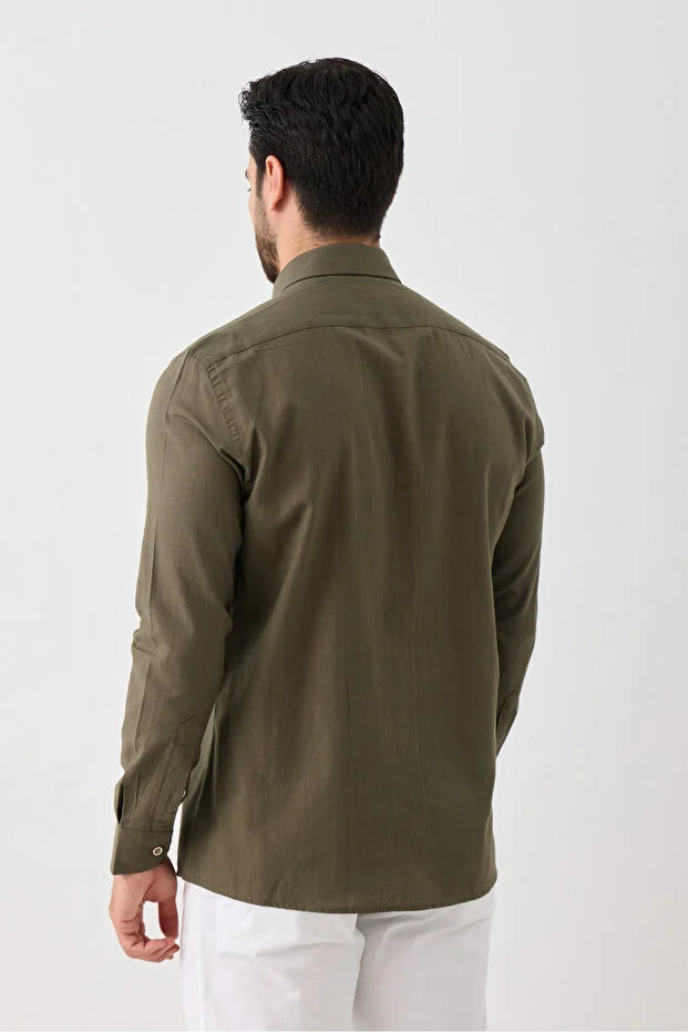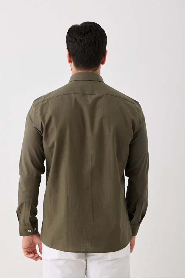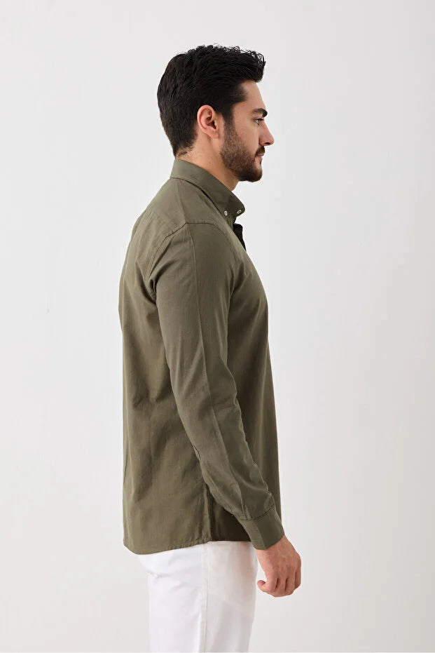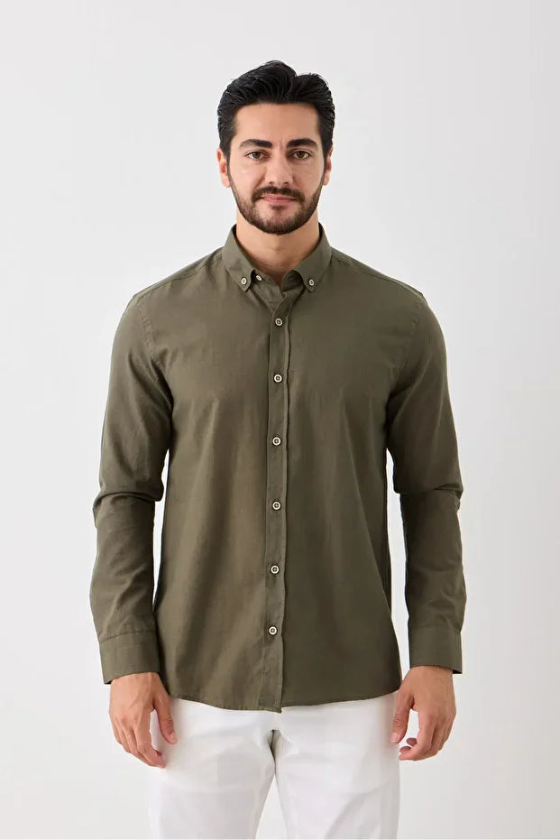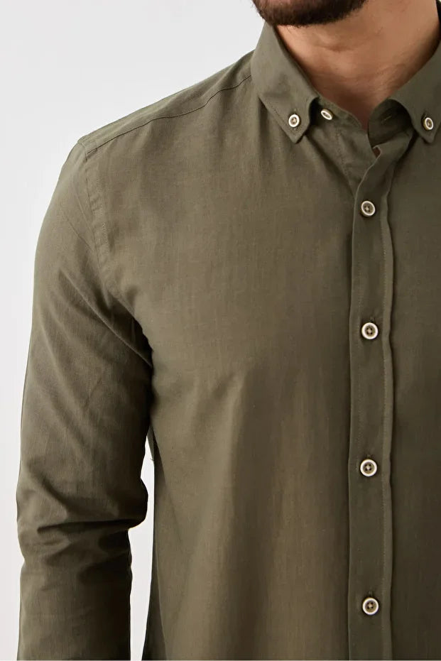 Uzun Kol %100 Pamuk Slim Fit Erkek Gömlek - Düğmeli, Keten Görünümlü, Serin Tutan Kumaş Haki