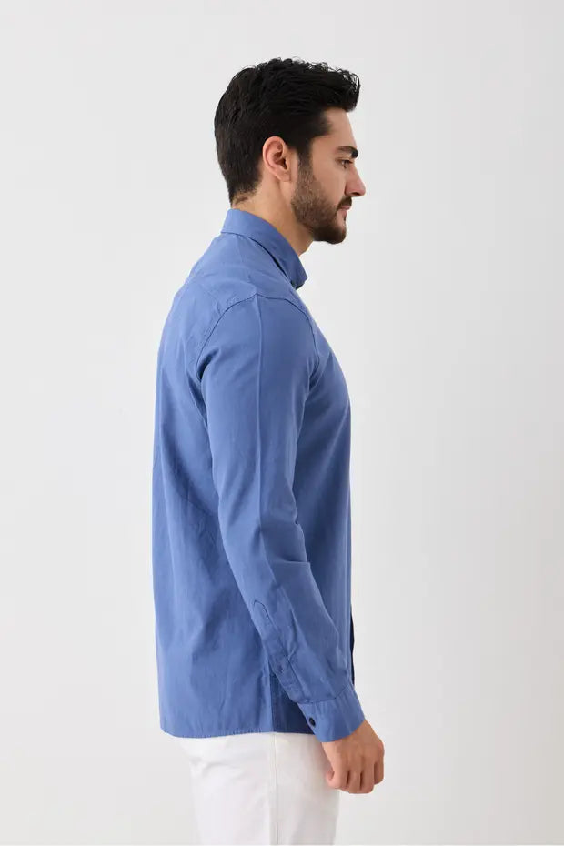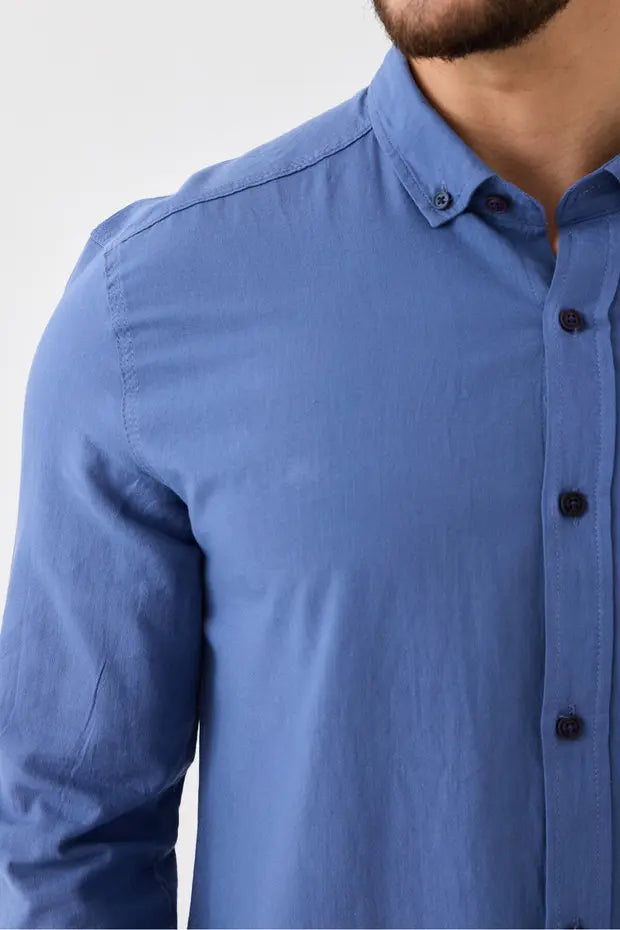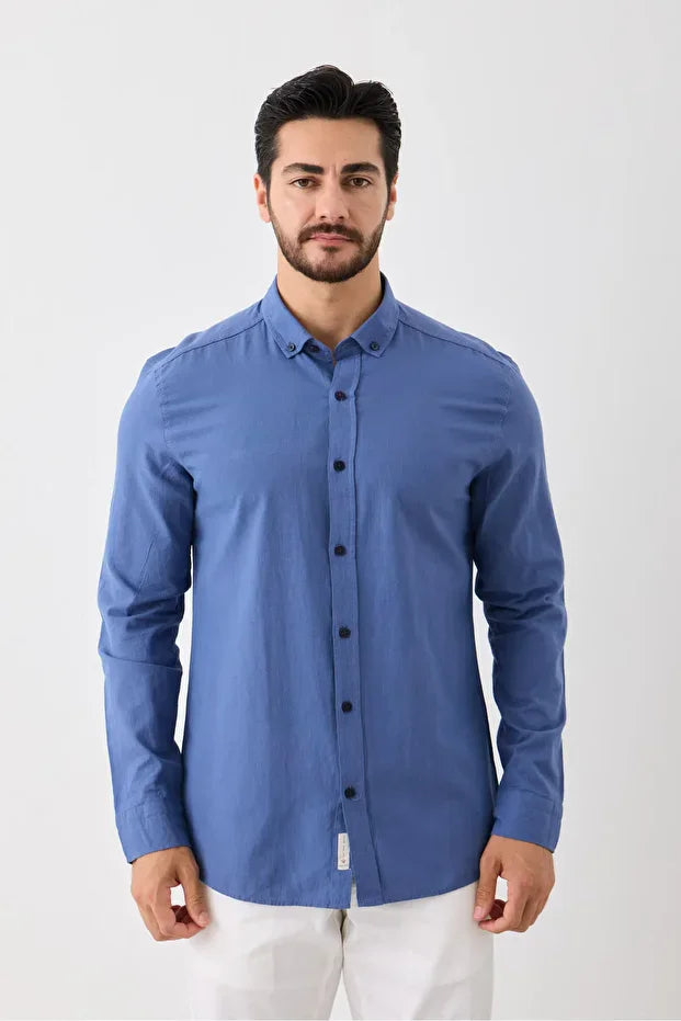 Uzun Kol %100 Pamuk Slim Fit Erkek Gömlek - Düğmeli, Keten Görünümlü, Serin Tutan Kumaş Mavi