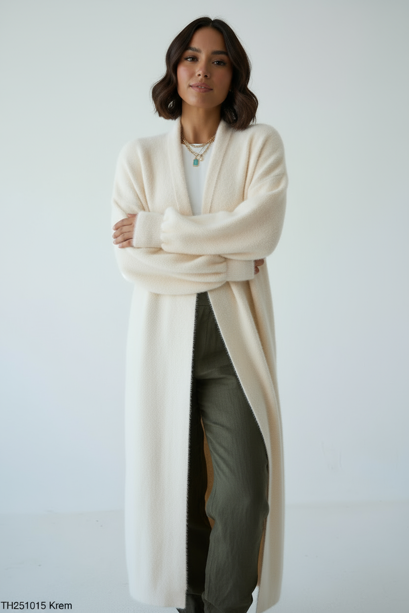 Ekstra Uzun Yumuşak Dokulu Maxi Boy Triko Hırka - Krem