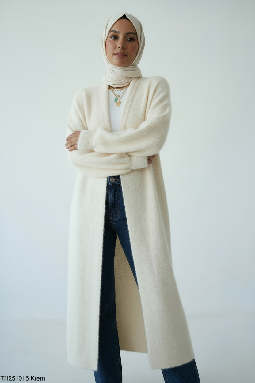 Krem Uzun Yumuşak Dokulu Kadın Hırka