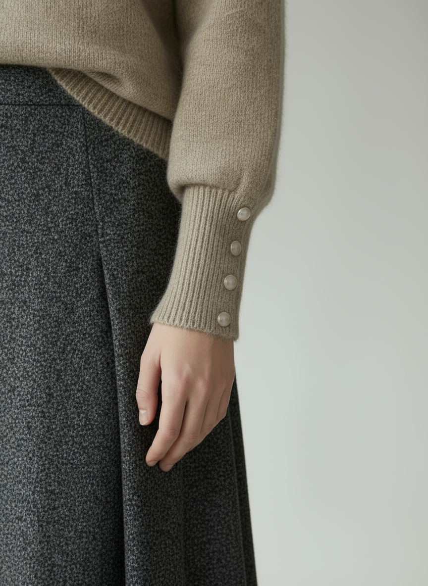 Zarif İnci Detayı: Kazağın manşetlerinde sıralanan zarif inci görünümlü düğmeler, bilek kısmına sofistike bir dokunuş katıyor. Bu küçük ama etkili detay, kazağın stilini bir üst seviyeye taşıyor.