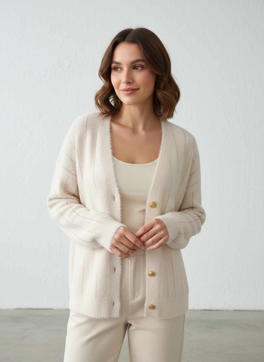 Gold Düğmeli İnce Çizgili Yumuşak Dokulu Triko Hırka