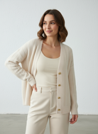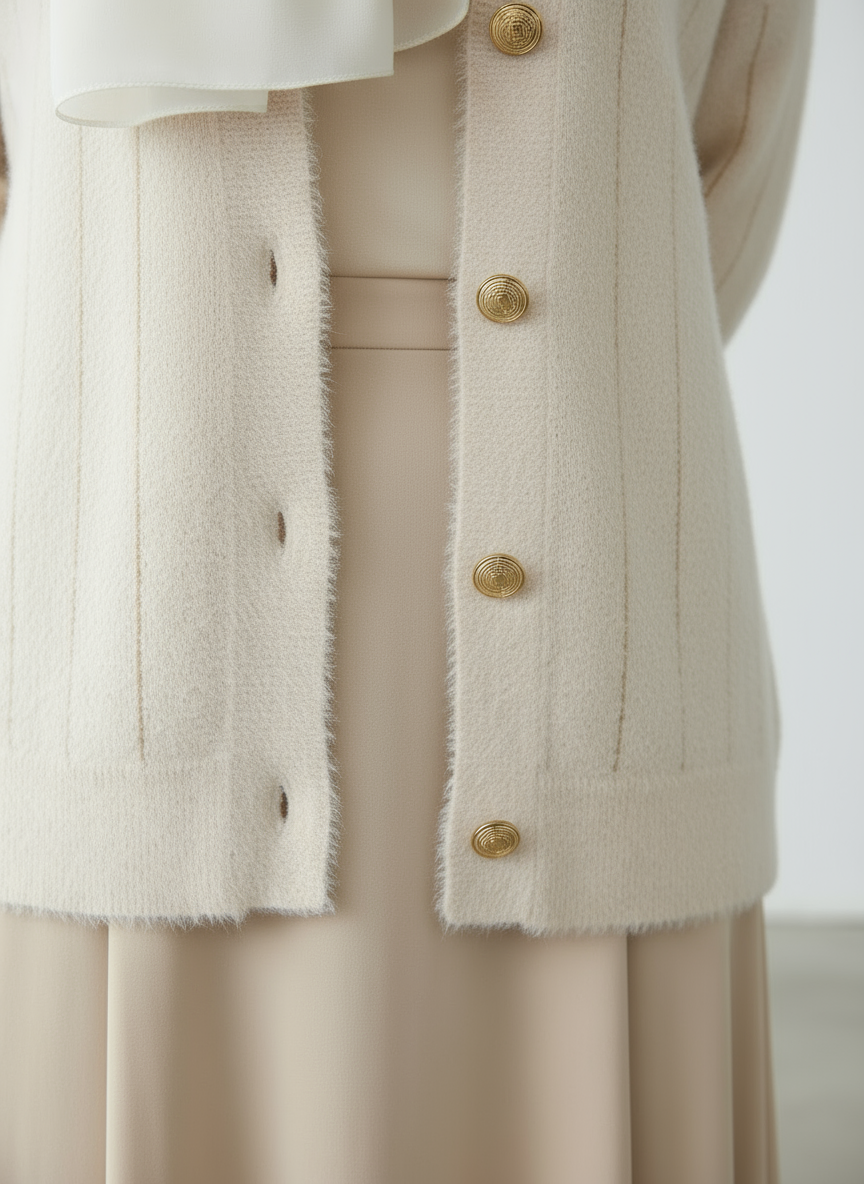 • Zarif Gold Detaylar: Hırkanın ön kısmındaki şık gold renkli metal düğmeler ve kumaşın üzerindeki ince gold iplik çizgiler (fitil detayları), ürüne anında lüks ve zengin bir hava katar.