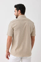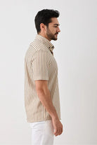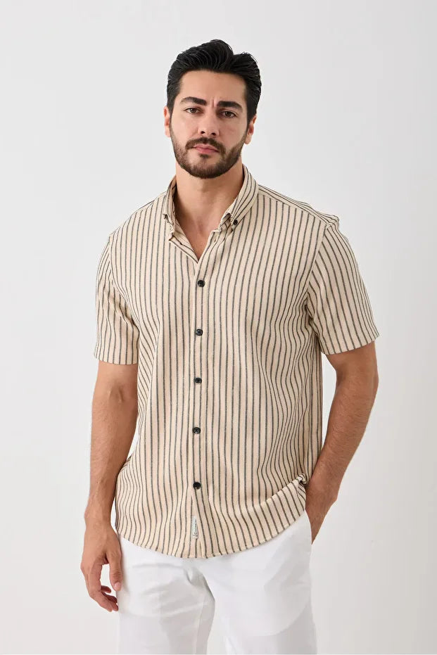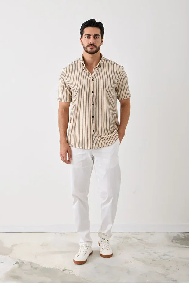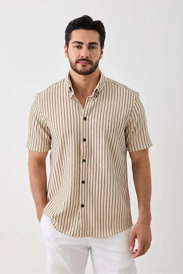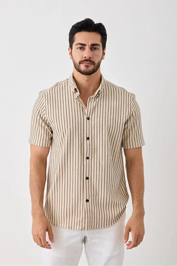 Kısa Kollu Çizgili Örme Erkek Gömlek - Esnek, Rahat, Çekmeyen Kumaş Bej