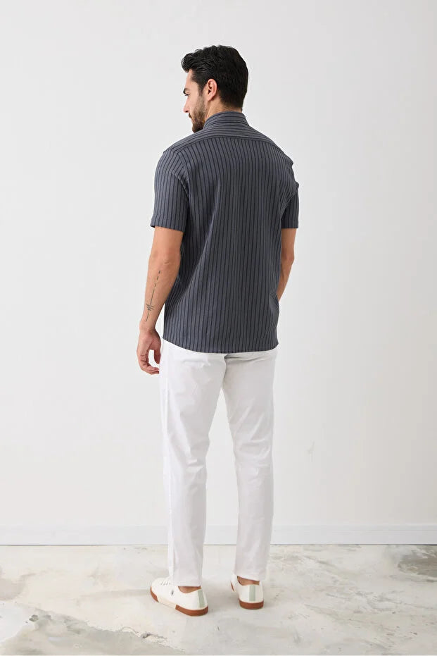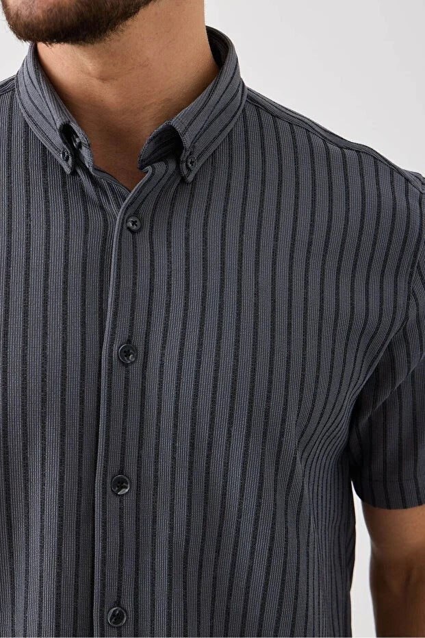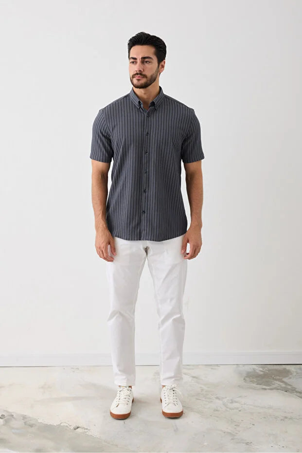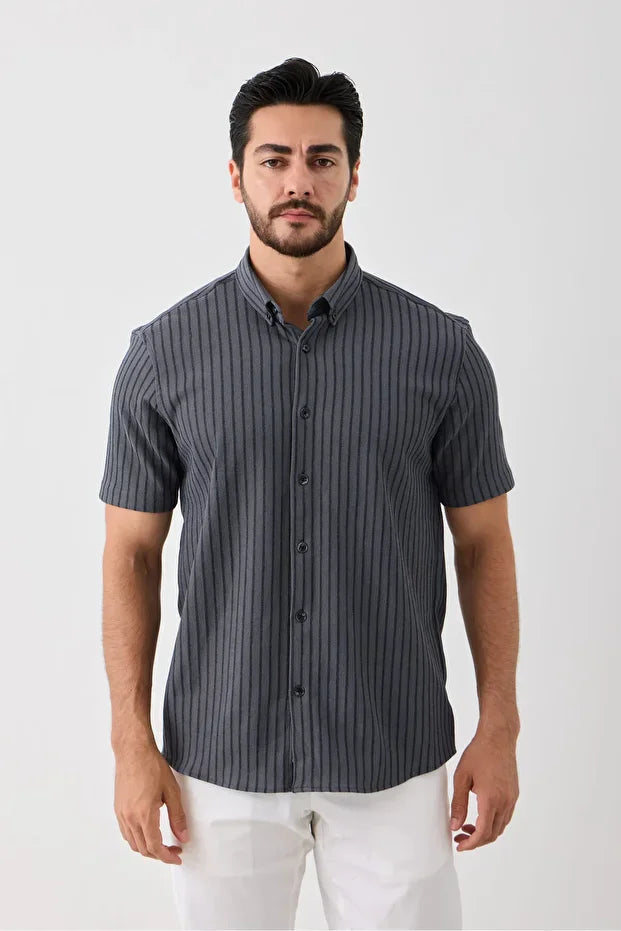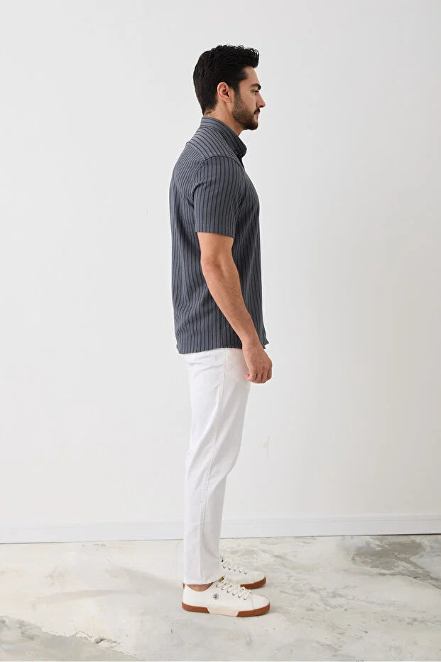 Kısa Kollu Çizgili Erkek Gömlek – Polyester Likra, Slim Fit, Rahat ve Şık Tasarım
