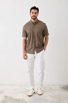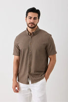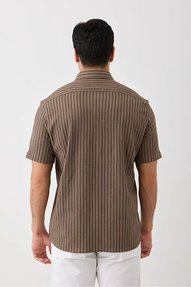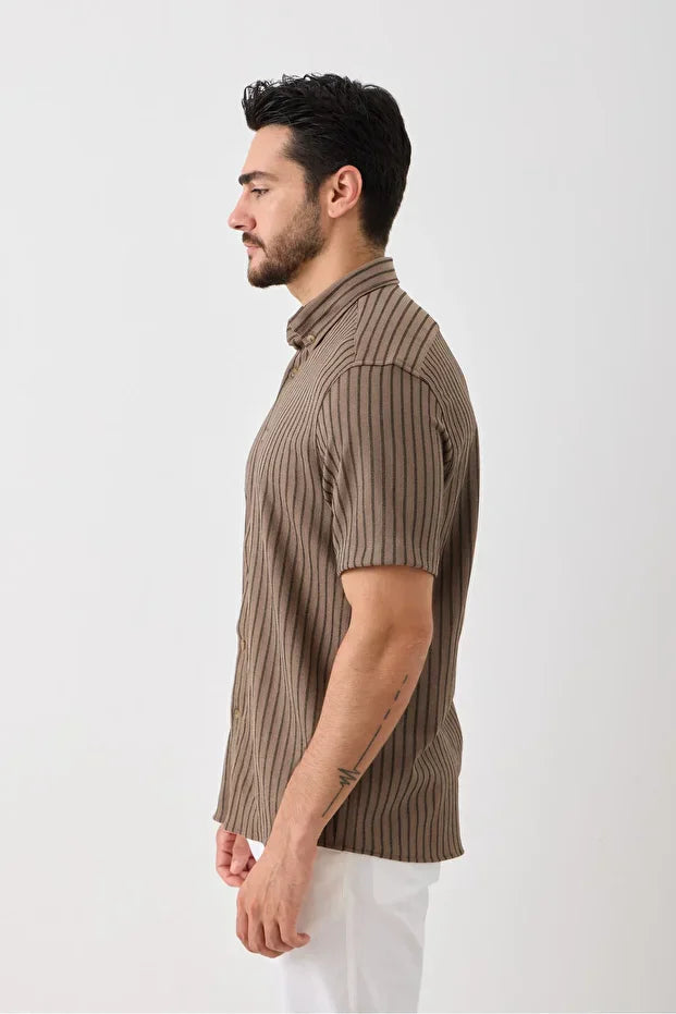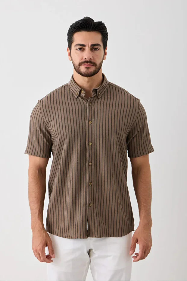 Kısa Kollu Çizgili Örme Erkek Gömlek - Esnek, Rahat, Çekmeyen Kumaş Kahverengi