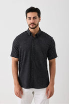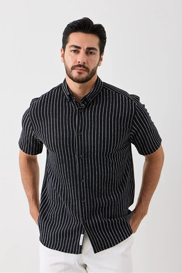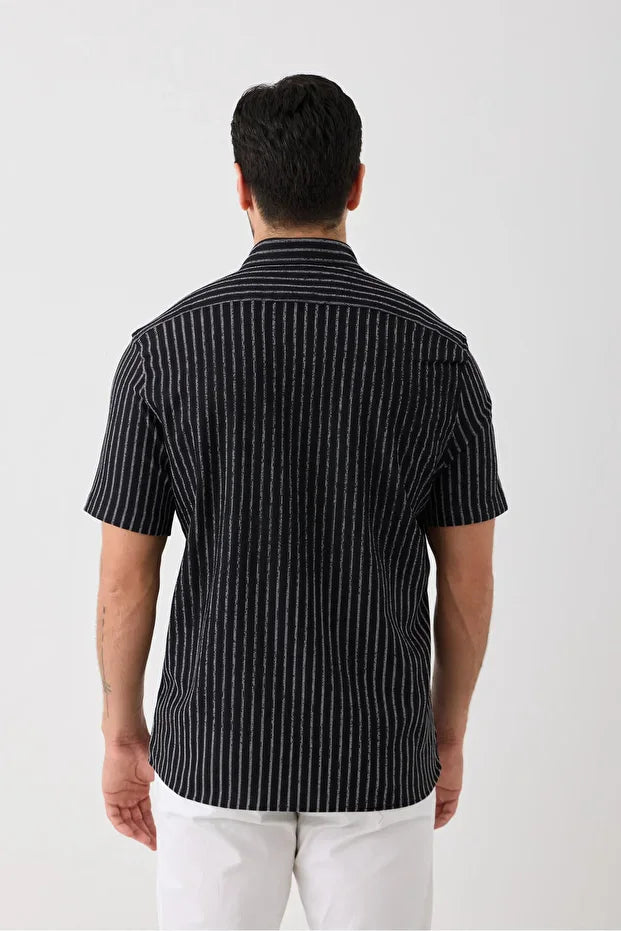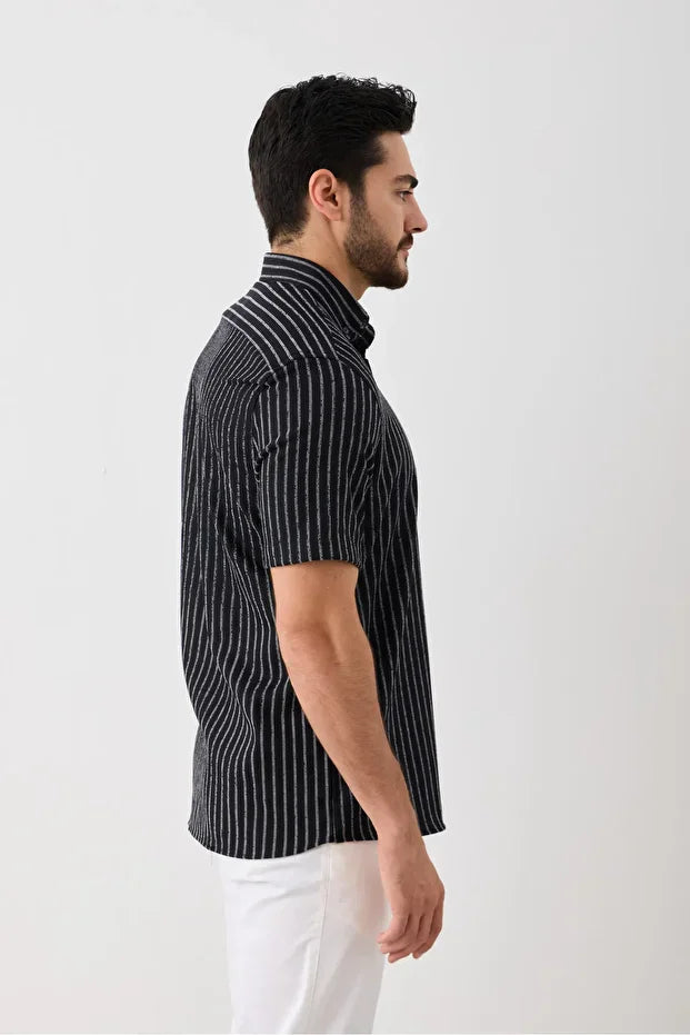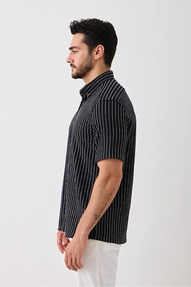 Kısa Kollu Çizgili Örme Erkek Gömlek - Esnek, Rahat, Çekmeyen Kumaş Siyah