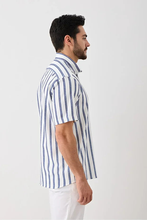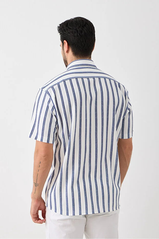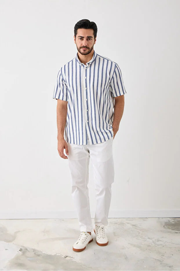 Kısa Kollu Çizgili Erkek Gömlek – Polyester Likra, Slim Fit, Rahat ve Şık Tasarım