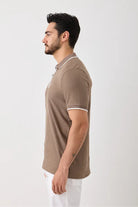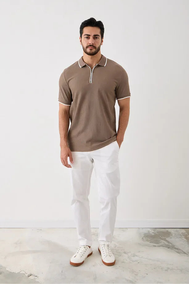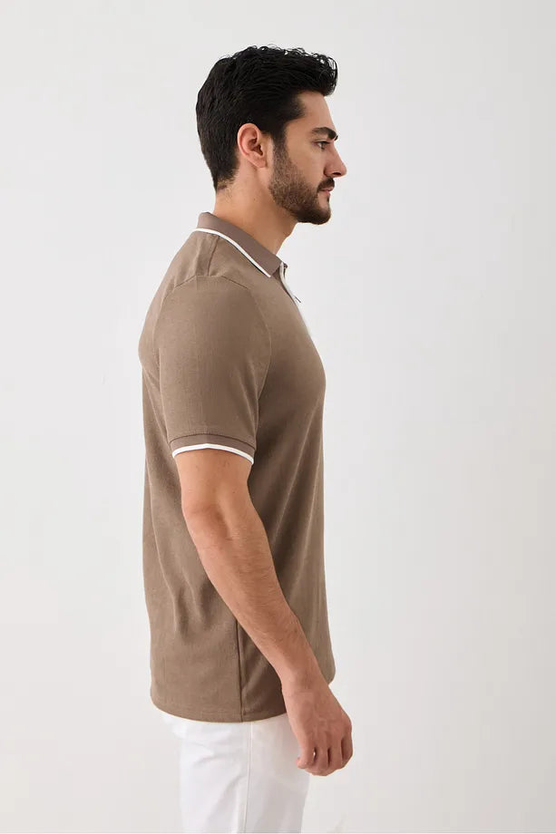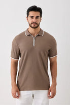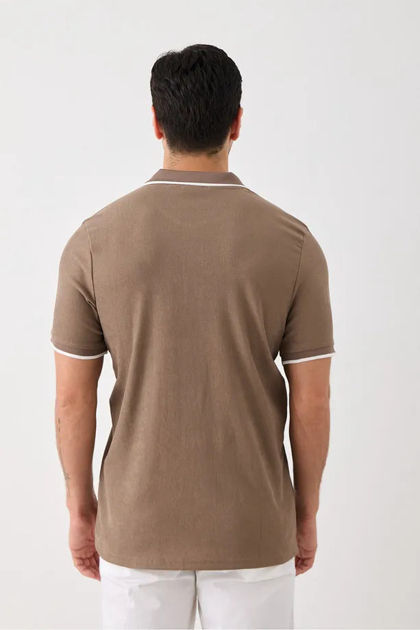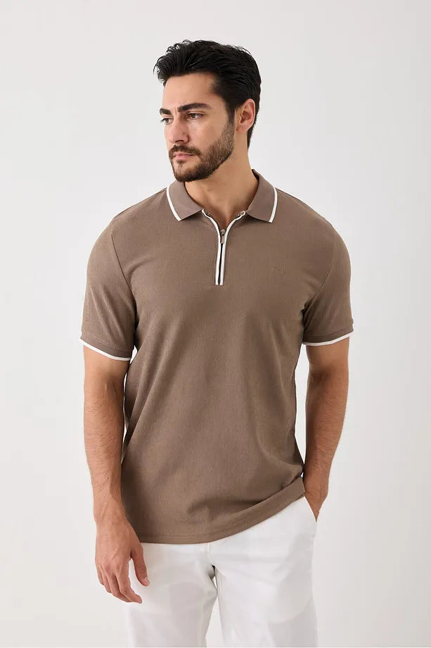 Kısa Kollu Örme Erkek Tişört - Polo Yaka, Fermuarlı, Nokta Desenli, Esneyen Tüylenmez Kumaş Kahverengi