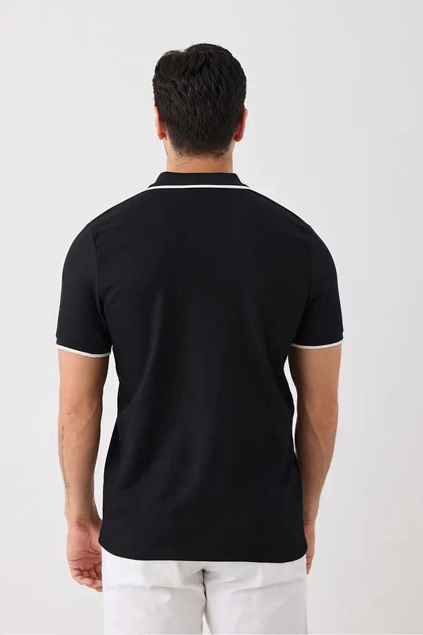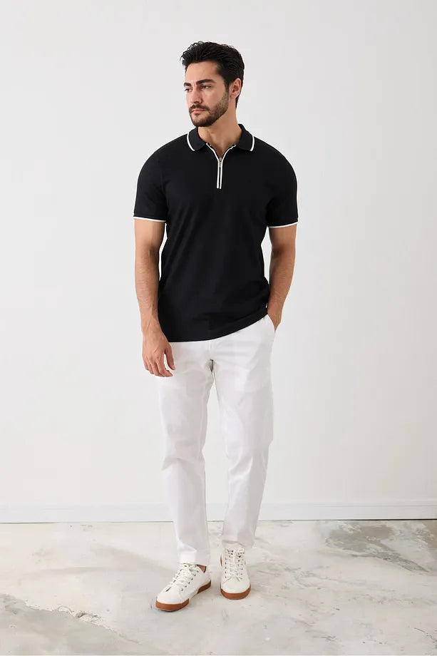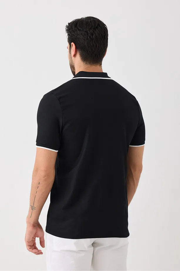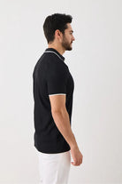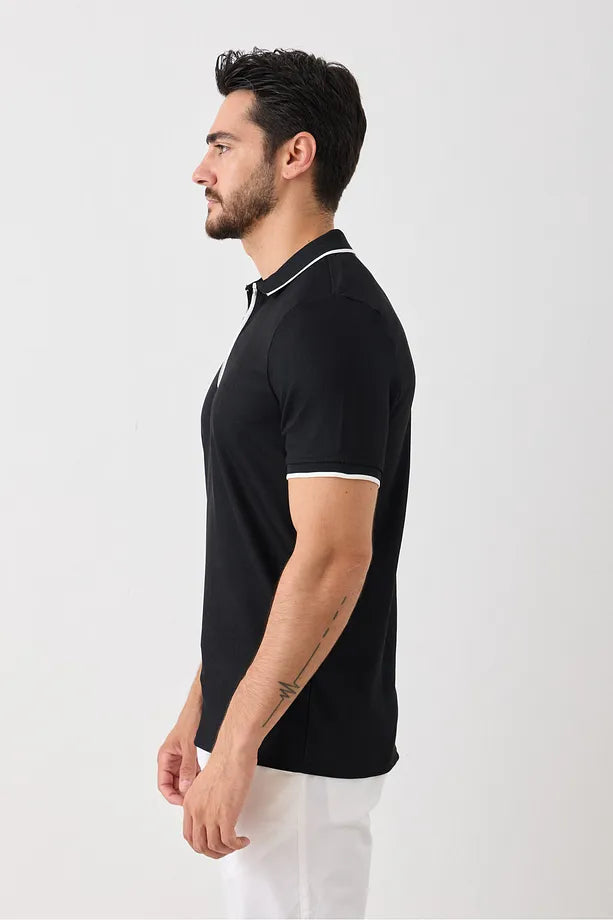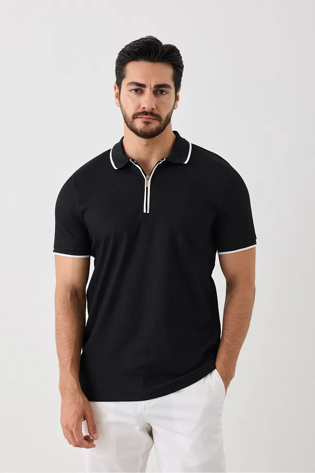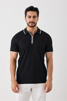 Kısa Kollu Örme Erkek Tişört - Polo Yaka, Fermuarlı, Nokta Desenli, Esneyen Tüylenmez Kumaş Siyah