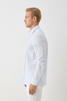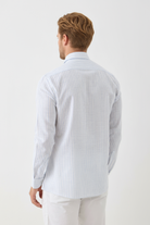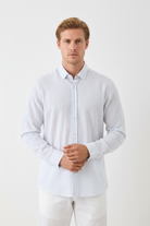 Keten Görünümlü %100 Pamuk Çizgili Mavi Erkek Gömlek