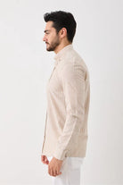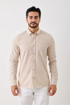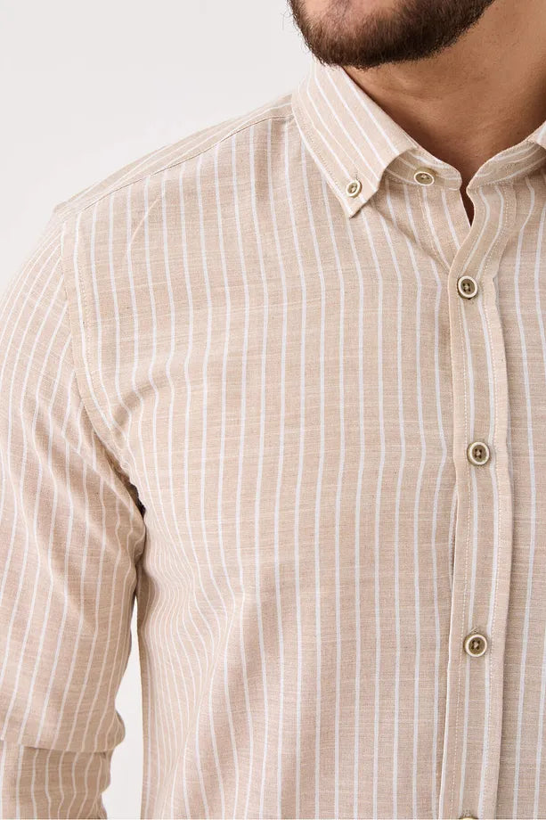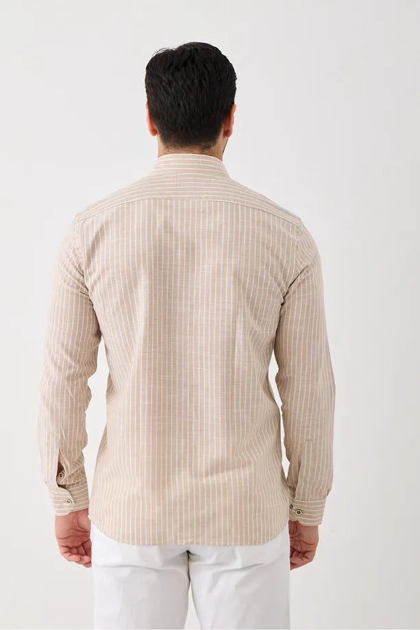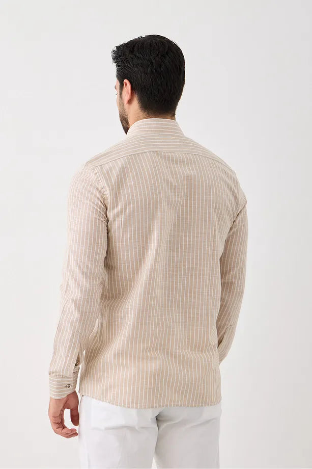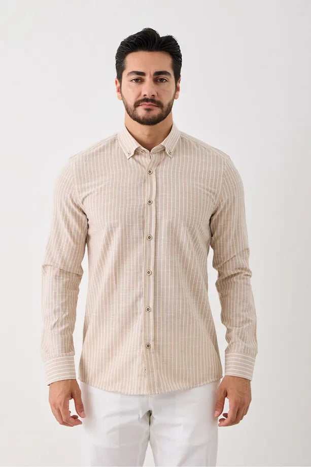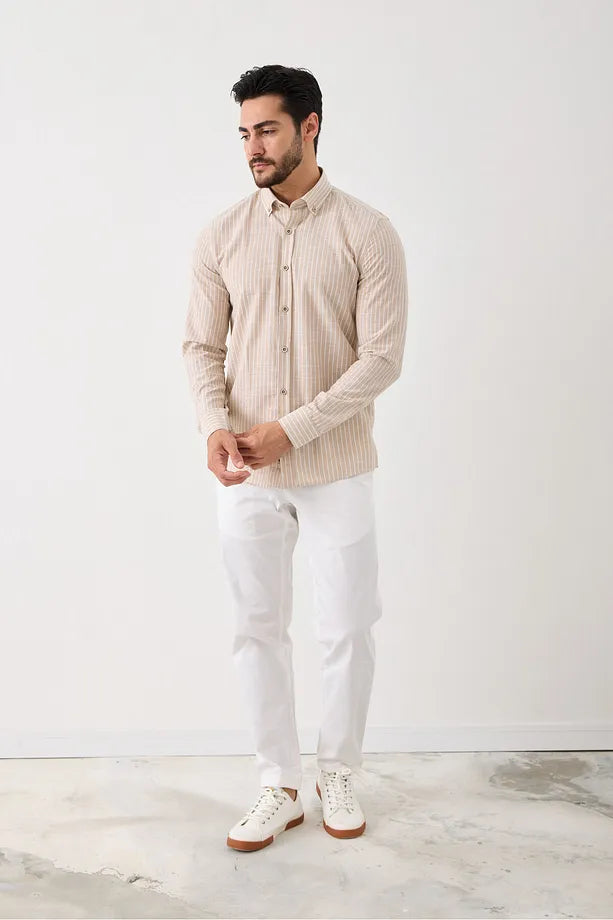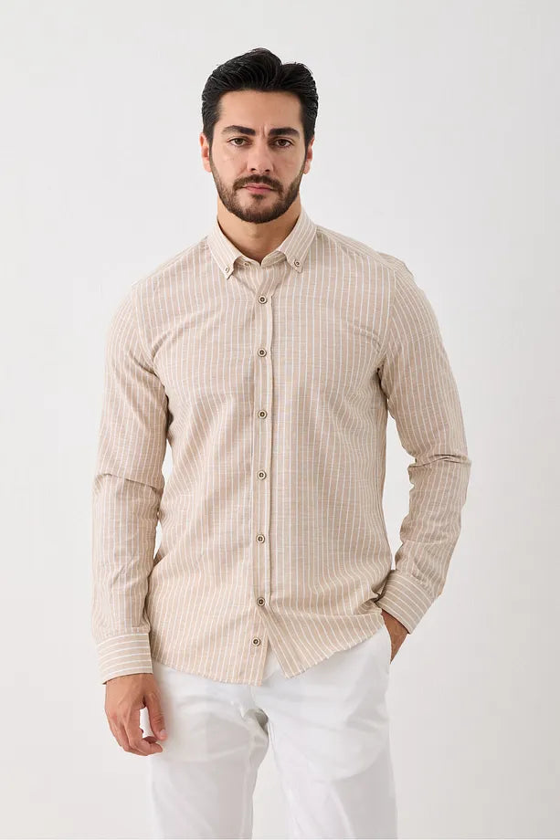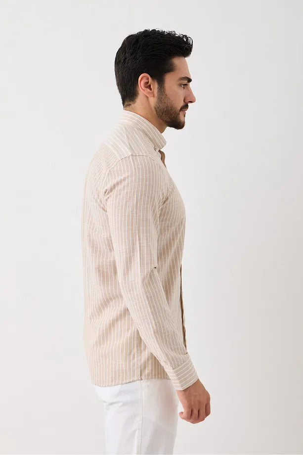 Uzun Kol %100 Pamuk Slim Fit Çizgili Erkek Gömlek - Düğmeli, Keten Görünümlü, Serin Tutan Kumaş Bej