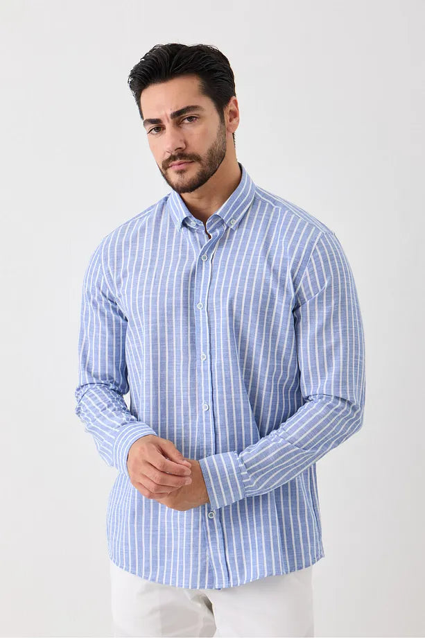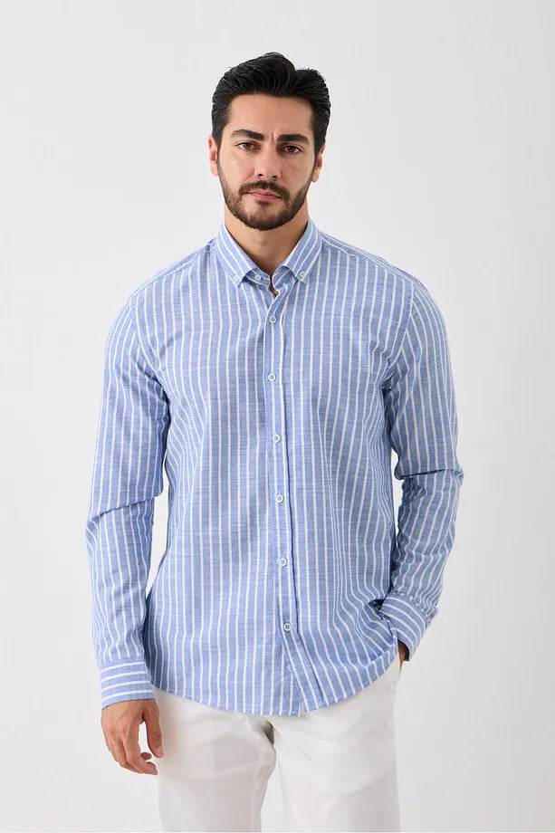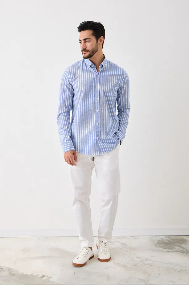 Uzun Kollu %100 Pamuk Erkek Gömlek – Düğmeli, Keten Dokulu, Slim Fit