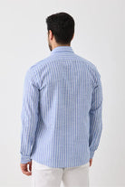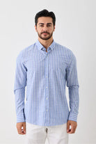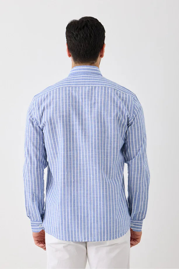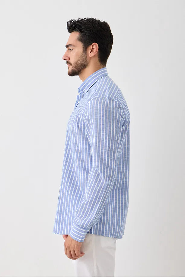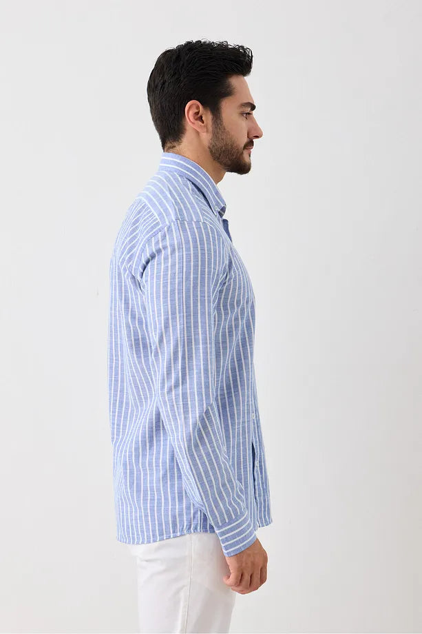 Uzun Kol %100 Pamuk Slim Fit Çizgili Erkek Gömlek - Düğmeli, Keten Görünümlü, Serin Tutan Kumaş Lacivert
