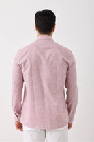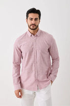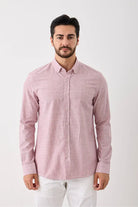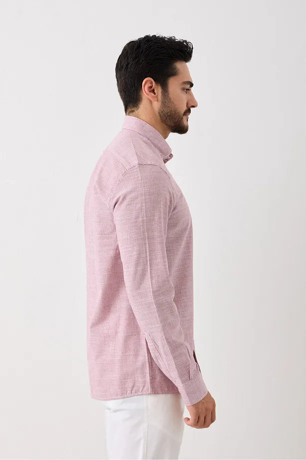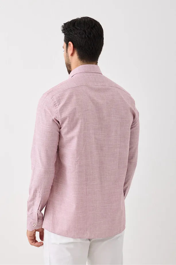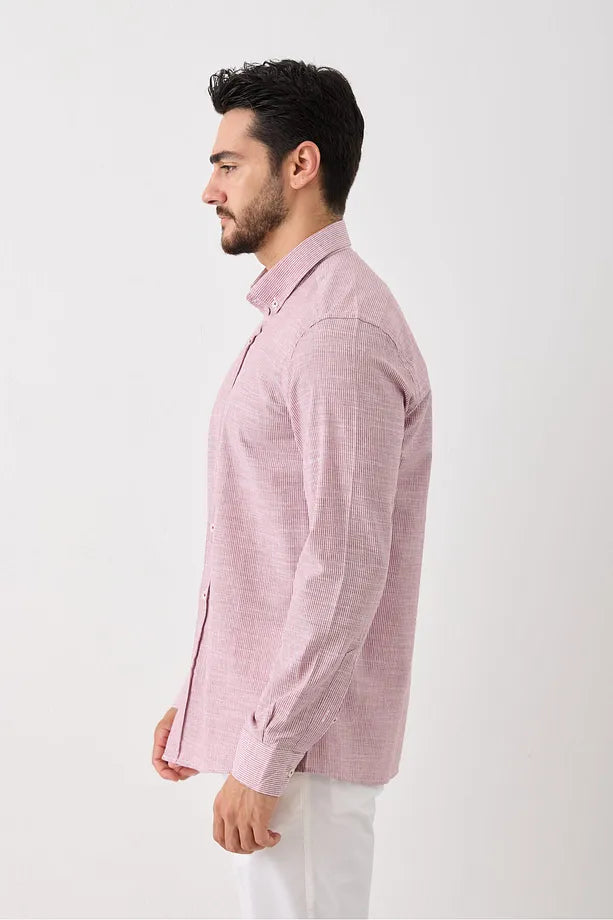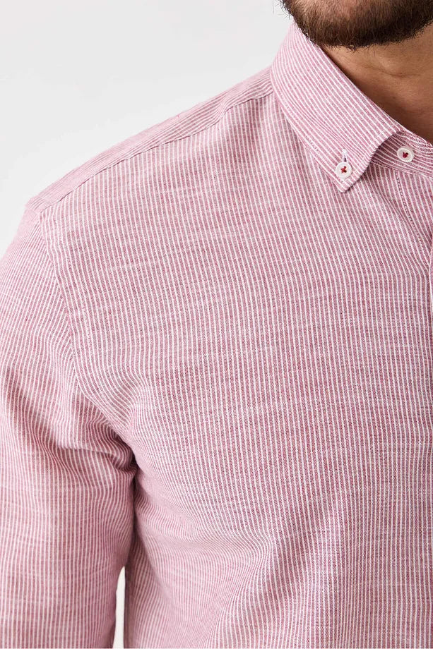 Uzun Kol Slim Fit Çizgili Erkek Gömlek - Serin Tutar, Terletmez, Pamuklu, Keten Görünümlü Kumaş Bordo