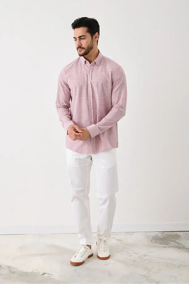 Günlük ve şık kombinler için ideal olan bu uzun kollu erkek gömlek, %100 pamuk ve keten görünümlü flamlı kumaşıyla doğal bir şıklık sunar. Slim fit kalıbı modern bir duruş sağlarken, nefes alabilen pamuk yapısı sayesinde sıcak ve serin havalarda mükemmel konfor sağlar. Terletmeyen ve serin tutan dokusu, tüm sezonlarda rahat kullanım imkanı verir. Düğmeli yaka detayı ve cepsiz tasarımı ile minimalist ve zarif bir görünüm oluşturur.